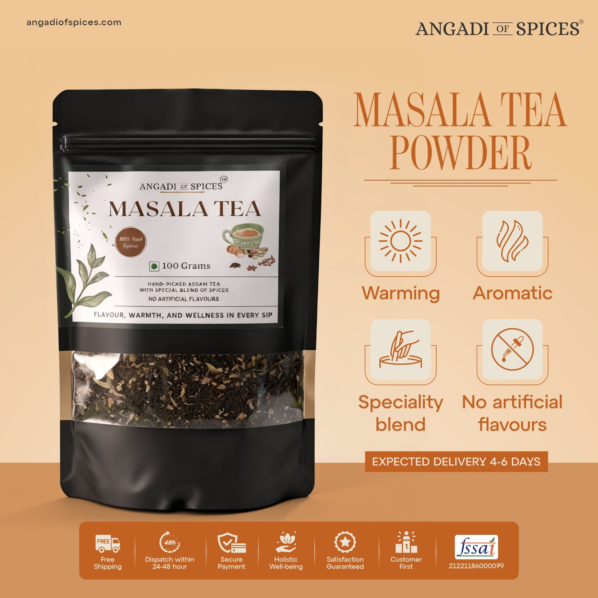 Cardamom, cinnamon, cloves, and ginger – blended with care. 100% natural, no artificial flavours, colours, or preservatives.
